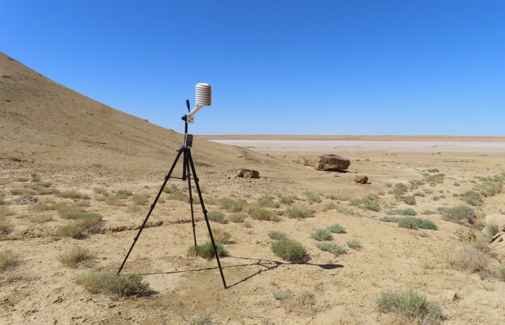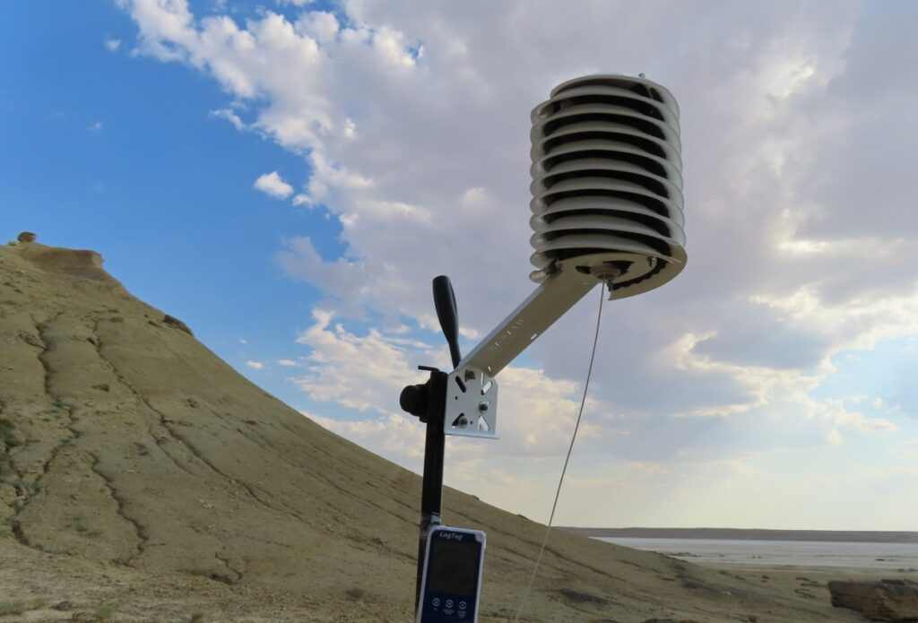 After a 10 km hike (around 2.5 hours) through the flat steppe, then the salt marsh, I reached the chosen location and soon installed the measuring equipment on the tripod. The logger started its operation at 10:46 AM showing 33.4 degrees as first reading.