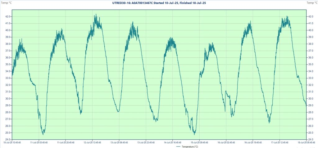 Az ég teljesen derült volt és így is fog maradni egész nap. Szokásomhoz híven, a felszerelés közelében tartózkodtam, időnként ellenőrizve a kijelző által mutatott értéket. A legmagasabb hőmérséklet 38.8 fok volt és délután 5 körül állt be.
