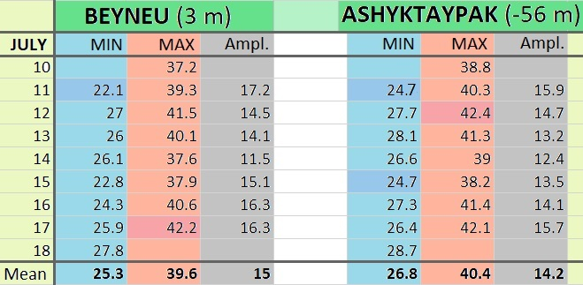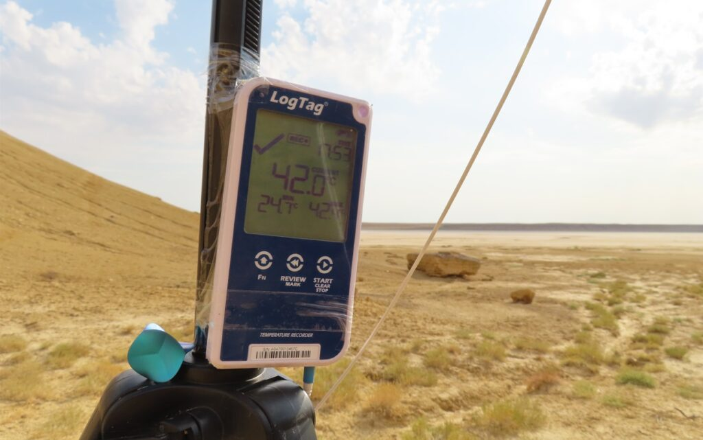 Másnap visszatértem Beyneu-ba, ahonnan 13-án indultam a következő terepmunkára. A táborba érkezve látom, hogy előző nap a hőmérséklet elérte a 42.4 fokot, ami az egész kutatás legmagasabb értéke fog maradni. Látogatásom idejében 41.3 fok volt a napi max (délután 3-4 óra közt), miközben az ég részlegesen felhőssé vált 2 óra után.